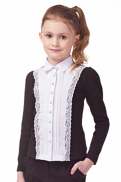 Блузка из трикотажного полотна в рубчик. Перед и воротник выполнены из блузочной ткани. Перед украшен кружевом. Застежка на декоративные пуговицы. Сборка по окату рукава.