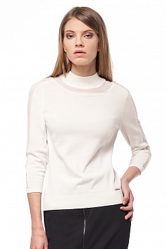 Джемпер мелкой вязки с рукавами 3/4 и небольшой горловиной. Под горловиной и по верхней части рукавов - декоративные вставки из полупрозрачной ткани.