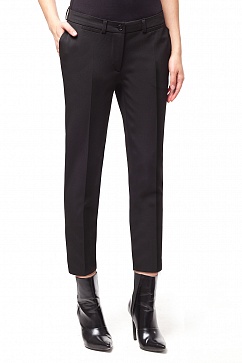 Укороченные брюки из плотной эластичной костюмной ткани. Боковые вертикальные карманы, спереди под поясом карманы-обманки с листочками. Застежка на пуговицe и гульфик на молнии.