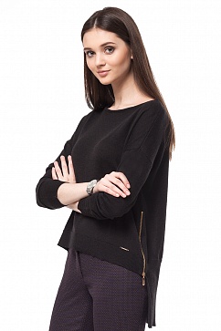Ультра-модный ассиметричный джемпер мелкой вязки из пряжи с меланжевым эффектом и содержанием шерсти. Деталь переда укорочена, внизу боковых швов небольшие декоративные замки-молнии. Вся фурнитура благородного золотистого оттенка.