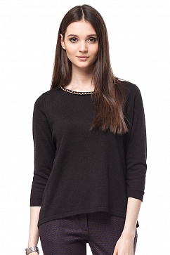 Джемпер тонкой, драпируемой вязки с небольшими декоративными разрезами внизу боковых швов. Ворот декорирован крупной цепочкой из золотистого металла с контрастной оплёткой.