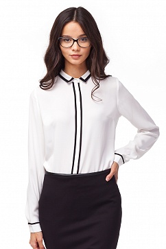 Блузка рубашечного кроя выполнена из плотной, драпируемой поли-вискозной ткани. Отложной воротник на стойке, планка и манжеты декорированы контрастным кантом.