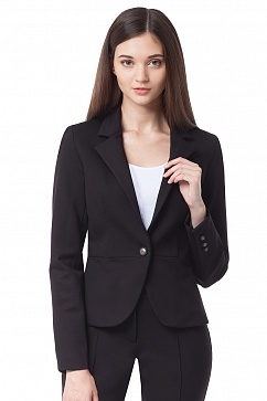 Жакет приталенного силуэта из плотного трикотажного полотна. Остроугольные лацканы и планка на одной пуговице, шлица по низу локтевого шва с тремя отделочными пуговицами. Изделие отрезное по линии талии, в шве два горизонтальных кармана. Подкладка- поливискоза стрейтч не стесняет движений и поддерживает эластичность трикотажа жакета.