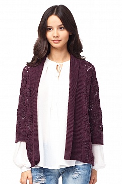 Жакет крупной фактурной вязки выполнен из мягкой пряжи натурального цвета. Силуэт прямой, рукав 3/4, без застежки.
