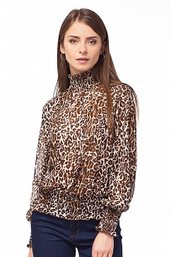 Лёгкая сексуальная блузка из полупрозрачной ткани. Высокий воротник, широкие манжеты и низ изделия со сборками на резинке. Застёжка на небольших пуговицах, на спинке небольшой узкий вырез.