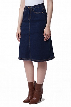 Юбка имеет классический джинсовый 5ти карманный дизайн, по силуэту расклешена к низу. Широкая отделочная строчка внизу. В больших размерах длина юбки за колено.