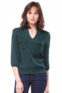 Блузка свободного силуэта, с втачным рукавом. Низ изделия и плечевой шов собраны на резинки. Воротник стойка с V-образным вырезом горловины. На груди накладные карманы с клапанами, пуговицы из натурального перламутра.