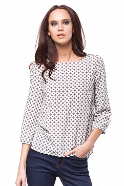 Блуза из тонкой поли-вискозной ткани с полуматовым отблеском. Прямой силуэт с удлиненной спинкой и скругленным нижним срезом. Рукава 3/4, эффектным украшением спинки является молния у горловины.