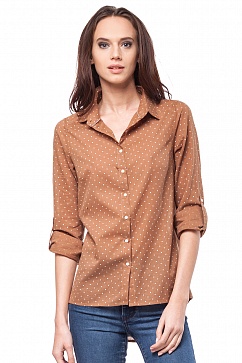 Блузка рубашечного покроя из хлопкового полотна в мелкий горох с отложным вопротником на стойке. Застёжка на пуговицах, уплотненные манжеты и воротник.