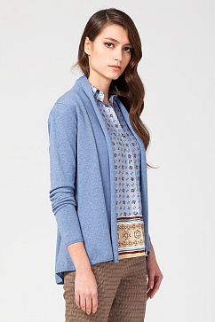 Жакет изготовлен из хлопковой пряжи с небольшим добавлением нейлона для придания мягкости. Борта широкие, отворачиваются в виде воротника-шаль. Низ по спинке длиннее, выполнен углом. На спинке декоративный шов с припусками наружу.