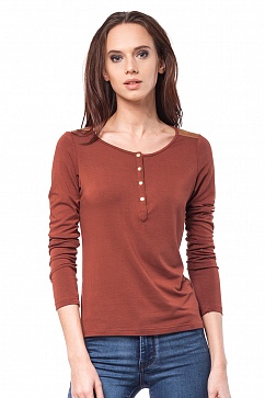 Тонкий трикотажный джемпер из качественной эластичной вискозы. Приталенный силуэт, застежка на планку на небольших золотистых кнопках. На плечах и планке декоративные вставки из иск. замши.