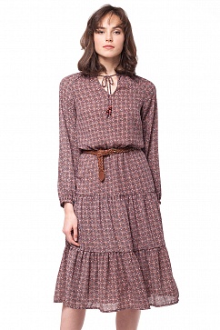 Платье женское из плотного искусственного крепового шелка на подкладке. Небольшой воротник-стойка завязывается на веревочки с бусинами на концах. Талия на резинке, юбка состоит из трех воланов со сборками для придания объема. Рукава присборены на узкой манжете с застежкой на пуговицу.