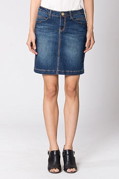 Юбка из плотного денима насыщенного синего цвета. Изделие прямого силуэта с посадкой чуть ниже талии, застёжка на молнию и пуговицу, 4 кармана.