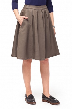 Юбка изготовлена из плотного хлопкового эластичного полотна. Посадка классическая - на притачном поясе, от пояса глубокие складки, придающие объем и пышность изделию. Боковые карманы. Застежка сзади на золотистую молнию с декоративной подвеской.