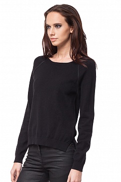 Романтичный джемпер ттонкой вязки с рукавом реглан. По линии втачивания рукава декорирован кантом из искусственной кожи. Вырез-капелька на спинке декорирован небольшим аккуратным бантом из искусственной кожи
