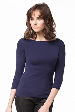 Базовая плотно прилегающая женская футболка. Вырез - лодочка, рукава 3/4. Низ изделия украшен золотистым логотипом.