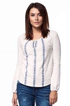 Блузка изготовлена из хлопкового фактурного трикотажа. Спереди и на рукавах принт ввиде вышивки. На горловине вырез-капля и небольшая сборка, закрепленная окантовкой. Низ рукава собран на резинку. Для покупателей детской одежды будет интересно приобрести похожую футболку для девочки F29.099. Популярный family-look!