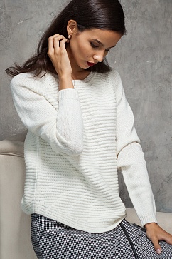 Джемпер крупной вязки изготовлен из мягкой, теплой пряжи с добавлением мохера. Горизонтальная вязка по низу заканчивается полукругом. Рукава реглан.