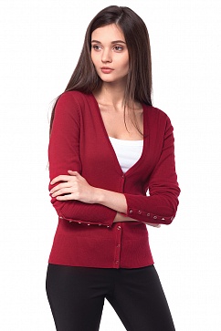 Жакет из хлопковой пряжи с добавлением нейлона для придания формоустойчивости изделию. Глубокий v-образный вырез, планка на эффектных пуговицах с эмалью в тон изделия. Широкая резинка по низу изделия и на манжетах.