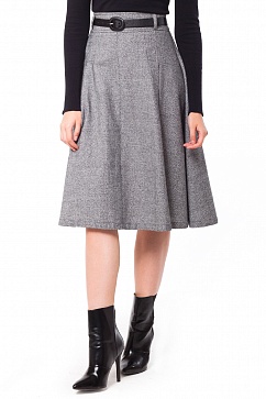Юбка выполнена из фактурной хлопковой ткани с меланжевым плетением под твид. Спереди широкие мягкие складки, зафиксированные сверху фигурной отделочной строчкой. Застежка на молнию.