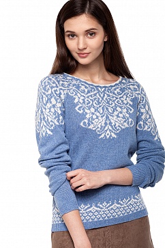 Уютный джемпер средней вязки из шерстяной пряжи, верхняя и нижняя часть изделия декорированы вывязанным орнаментом, низ и манжеты вывязаны "резинкой".