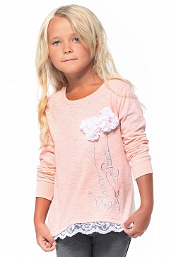 Джемпер из футера с вышивкой и контрастной аппликацией в виде цветов. Низ изделия декорирован кружевом.