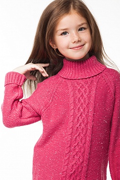 Удлинённый свитер из хлопковой фактурной пряжи. Спереди декоративная вязка "косами". Широкий воротник с отворотом, манжеты и низ изделия вязаны резинкой.