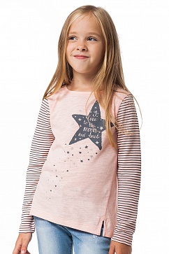 Футболка из хлопкового полотна, декорированная принтом с блестками. Изделия с удлиненной спинкой и двумя боковыми разрезами.
