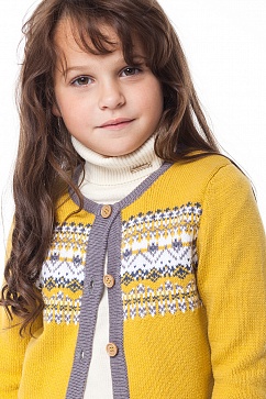 Вязанный жакет с жаккардовым рисунком. Спереди застежка на пуговицы.