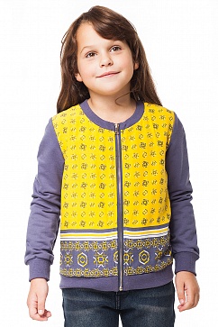 Жакет из мягкого футера. Перед двойной: нижняя часть выполнена из основного полотна, верхняя из отделочной вискозы с декоративным орнаментом . Застежка на металлическую молнию золотого цвета.