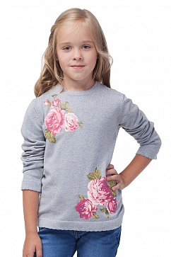 Вязанный джемпер из тонкой пряжи. Спереди принт "розы", низ изделия, горловина и манжеты выполнены декоративной вязкой. На спинке вырез-капля с застежкой на пуговицу.