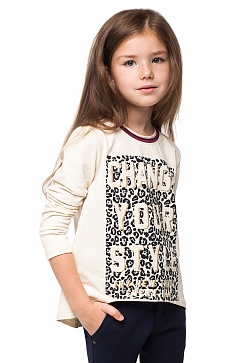 Футболка из хлопкового трикотажа с удлиненной спинкой и горловиной контрастного цвета с открытым срезом. Перед декорирован принтом с глиттером.