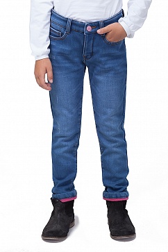 Джинсы для девочки, утепленные флисом контрастного цвета. Джинсы декорированы потертостями и отделочными строчками контрастного цвета.