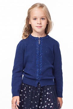 Вязанный жакет из тонкой пряжи с застежкой на крючки. Перед изделия и окантовка горловины украшены декоративными металлическими стразами.