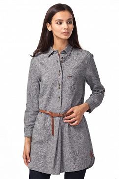Удлиненная блузка выполнена из плотной хлопковой ткани крупного, фактурного плетения. Накладной карман на груди, от планки спереди отходит мягкая двойная складка. Боковые разрезы декорированы кожаными вставками. Рукава регулируются при помощи отворота и застежки на пату. Ремешок входит в стоимость.
