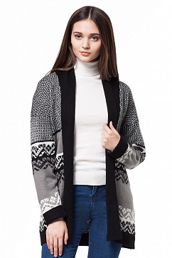 Уютный, теплый жакет выполнен из плотной пряжи с добавлением шерсти, верхняя часть изделия - жаккард. Свободный силуэт, спущенная пройма, завязка-пояс из основной пряжи.