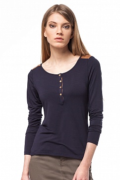 Тонкий трикотажный джемпер из качественной эластичной вискозы. Приталенный силуэт, застежка на планку на небольших золотистых кнопках. На плечах и планке декоративные вставки из иск. замши.