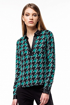 Блузка прямого силуэта, выполнена из плотного матового полиэстера с принтом с принтом. Глубокий v-образный вырез оформлен планкой с отделочной строчкой по краям. По бокам не большие разрезы.