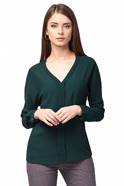 Блузка выполнена из мягкой, матовой, хорошо драпируемой ткани. Спереди глубокий V-образный вырез переходит в декоративную планку. Рукава со спущенным плечом. Сзади кокетка, декорированная складками.