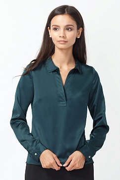 Блузка прямого силуэта, выполнена из эластичной полуматовой атласной ткани. Глубокий v-образный вырез оформлен планкой с отделочной строчкой по краям. По бокам не большие разрезы.