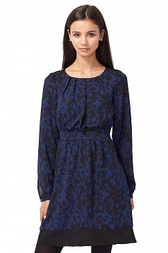 Платье из плотного синтетического шелка с эффектным сине-черным принтом под леопарда. Кокетка и нижний волан выполнены из черного шифона. Кокетка декорирована металлическими заклепками. Манжет на перламутровой пуговке, есть возможность регулировать манжет по длине. Отрезной пояс плотно прилегает по талии.