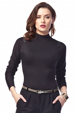 Джемпер из трикотажной вискозы с небольшой горловиной и длинным рукавом. На плечах декораивные контрастные вставки из мягкой искусственной кожи. Крой рукава летучая мышь со сборкой по окату.