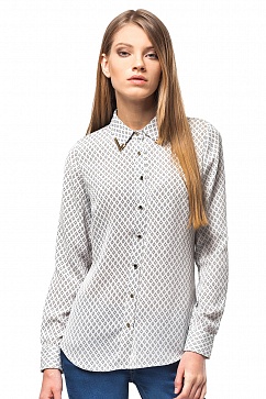 Блузка выполнена из плотной блузочной ткани с мелким принтованным узором. Классическая форма блузки обыграна золотыми наконечниками на углах воротника и золотистыми пуговицами на планке застежки. Манжеты фиксируются так же на золотистые пуговицы.