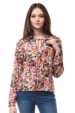 Блузка из мягкой непрозрачной ткани с цветочным принтом и небольшим воротником-стокой. Модель полуприлегающего силуэта с застежкой на пуговицы и небольшими сборками по кокетке, край кокетки и манжет декорирован кантом из искусственной кожи.