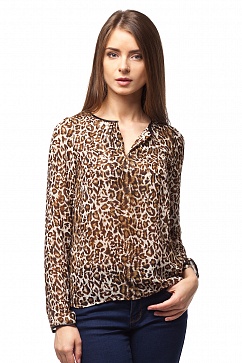 Блузка свободного силуэта с небольшим вырезом с разрезом и мелким геметричным принтом. Край воротника и манжеты рукавов окантованы мягкой, качественной искусственной кожей.
