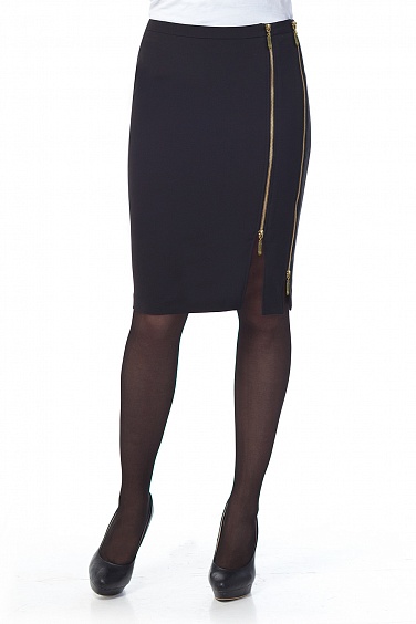 Стильная плотно прилегающая юбка-карандаш. Перед изделия декорирован двумя молниями разной длины,внизу молний ассимитричные разрезы.