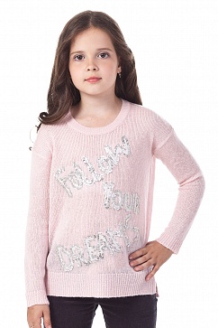 Вязаный джемпер с удлиненной спинкой. Перед декорирован вязкой из пряжи контрастного цвета и пайетками