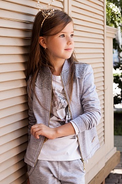 Жакет в спортивном стиле из футера на молнии с декоративной подвеской. Воротник стойка. Кокетка декорирована кружевом в тон изделия. Оригинальный крой жакета с расклешением к низу и баской. Спереди металлическая нашивка с логотипом.