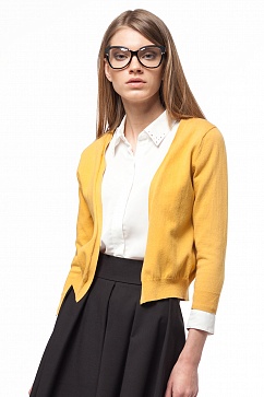 Лёгкий жакет тонкой вязки без застёжки. Благодаря небольшому содержанию искусственных волокон не теряет форму, износостойкий.
