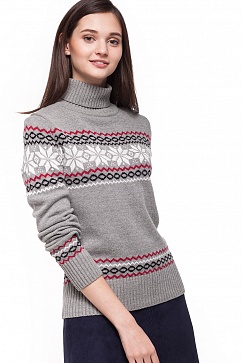 Свитер выполнен из мягкой хлопковой пряжи с добавлением акрила, который обеспечивает яркость красок, придает мягкость и тепло. По груди и рукавам в верхней части трехцветный узор - снежинки . Орнамент по низу над резинкой. Ворот стойка связан эластичной вязкой резинкой для лучшего прилегания.
